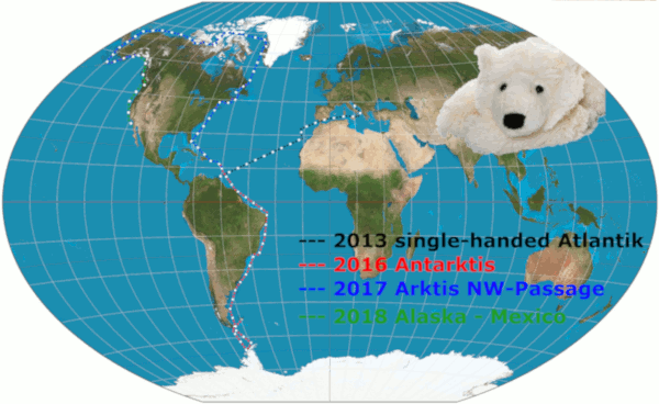 Eisbär Zulumbus wurde zufällig in Uruguay gerettet und begleitet mich seither auf meinen Fahrten über das Meer: