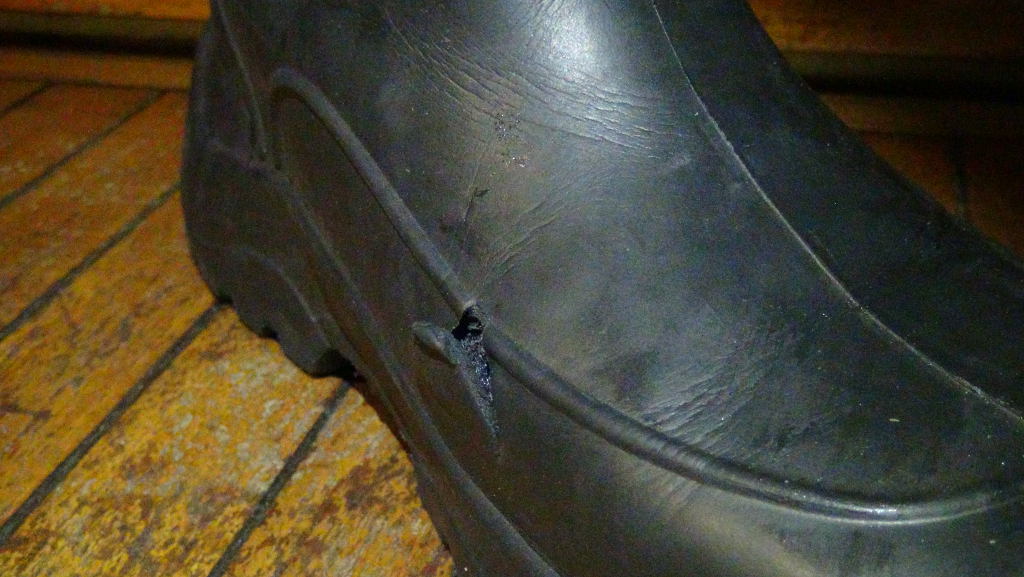 Alaska_Gummistiefel_RissBereits nach dem ersten härteren Einsatz hatte einer der Stiefel ein ca. 3cm großes Loch.